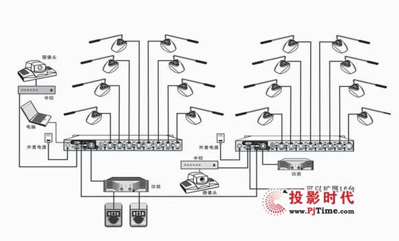 手拖手型會議系統(tǒng)中的每個單元配一只傳聲器和一只小型揚聲器,各單元之間通過1根多芯電纜串聯(lián)連接,“手拖手”即由此得名。