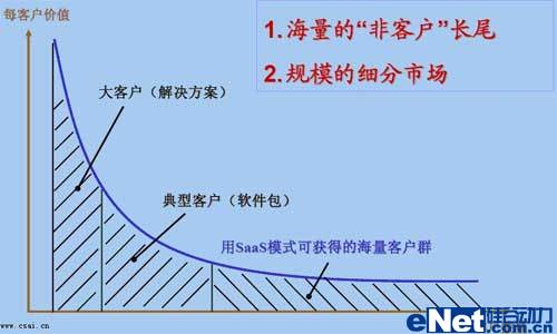 SaaS模式就是不論是什么樣的客戶(hù)都向其提供服務(wù),不論服務(wù)的時(shí)間長(zhǎng)短,不論身處何地。傳統(tǒng)軟件是很難適應(yīng)普通客戶(hù)的,普通客戶(hù)付不出更多的投資,也不想軟件、硬件、服務(wù)都全面去投資,這樣就只有放棄使用軟件了。自然,軟件市場(chǎng)就少了一大群消費(fèi)者。而SaaS模式將不細(xì)分客戶(hù)類(lèi)型,讓人人都可使用軟件,讓個(gè)個(gè)都消費(fèi)得起軟件?上攵,這是一個(gè)怎么龐大的市場(chǎng)。如下圖所示:
