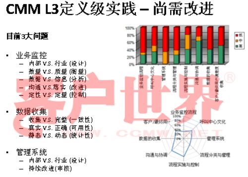 接下來我用一個很小的案例結(jié)束今天的分享,我們整個的呼叫中心的成熟度模型目前是在電信行業(yè)開始了2008年版的推廣,成熟度模型經(jīng)歷從07年成立亞太呼叫中心產(chǎn)業(yè)聯(lián)盟以后,由一群這個行業(yè)里面的專家,特別是中國產(chǎn)業(yè)市場的發(fā)展建立起的標(biāo)準(zhǔn),一年以來在通信行業(yè)我們做的能力成熟度的判定有一些很有意思的啟示,通信行業(yè)占到我們整個呼叫中心產(chǎn)業(yè)約70%的坐席,是最大的、最有代表性的產(chǎn)業(yè)。做下來真的很有代表性,普遍性在于環(huán)境建設(shè)、資產(chǎn)投入、資產(chǎn)配置,所以這下面的雷達(dá)就可以看到,相對完善都是在環(huán)境建設(shè),功能區(qū)建設(shè),整體空間設(shè)計、硬件相對來說比較偏硬的一些。在其他方面偏廢的比較厲害。第二個雷達(dá)在一些獎懲管理、信息管理,整個軟性方面幾乎有很濃重的一些計劃經(jīng)濟(jì),制造行業(yè)的一些領(lǐng)域相對來說比較成熟。我們目前看到的,基本上通信行業(yè)的一些發(fā)展在能力成熟度上是二級到四級,尤其以二到三級的發(fā)展更為普遍。通常的方法為期一周的標(biāo)桿調(diào)研,看所有的呼叫中心發(fā)展的五個方面,我們才會在里面做這樣的判定。在能力成熟度的三級,我們做了一些企業(yè)發(fā)現(xiàn),特別在三級,關(guān)于能不能對流程進(jìn)行一致性管理方面,就是剛才李老師講到的不是最急的,而管理是最重要的。可能所有的流程多多少少有一些成熟度的問題,但是我們的源頭流程能力在三個方面有很大的差距:一個是業(yè)務(wù)監(jiān)控流程,第二個數(shù)據(jù)收集流程,還有一個是管理系統(tǒng)的審核流程。這個大家可以和自己的呼叫中心比一比。