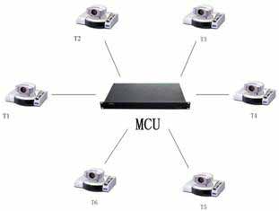 在會(huì)議場(chǎng)點(diǎn)數(shù)目不多且地域分布比較集中時(shí),可采用單MCU方式,其組網(wǎng)結(jié)構(gòu)見圖所示。圖中T1-T6均為視頻會(huì)議終端系統(tǒng)設(shè)備。