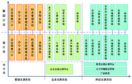 從系統(tǒng)的部署來看,主要集中在集團(tuán)與省公司,其中,集團(tuán)公司系統(tǒng)主要具備面向全公司的企業(yè)管理、經(jīng)營分析等功能;省公司從以職能管理為主逐步轉(zhuǎn)變?yōu)橐陨a(chǎn)管理為主,具有了越來越多的生產(chǎn)職能,在運營支撐系統(tǒng)建設(shè)中的作用更加突出;市公司的生產(chǎn)管理職能有所削弱,將主要負(fù)責(zé)市場的具體營銷、客戶支撐以及設(shè)備的現(xiàn)場維護(hù)等工作,F(xiàn)有系統(tǒng)主要存在以下幾個問題:
