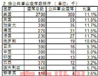 美國擁有全世界最多的座席,達到270萬個,公共事業(yè)座席30萬個,占11.1%;除美國以外,公共事業(yè)類座席總數(shù)排名在第2~6名的依次是:英國,加拿大,德國,法國,俄羅斯。
