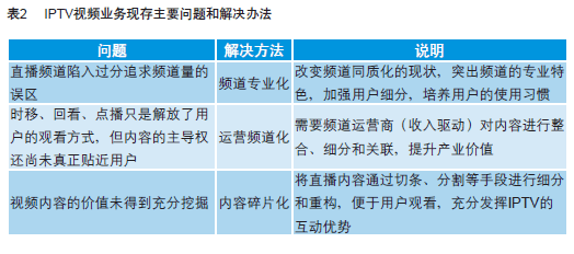 IPTV發(fā)展中,傳統(tǒng)視頻業(yè)務(wù)既是切入點(diǎn),也是業(yè)務(wù)收入的重要來(lái)源。但目前視頻業(yè)務(wù)的價(jià)值還未得到充分體現(xiàn),互動(dòng)性?xún)?yōu)勢(shì)還未得到充分挖掘。主要問(wèn)題和解決辦法如表2所示。
