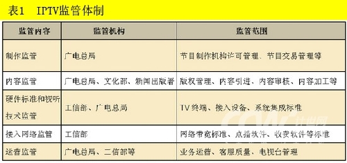 根據(jù)國務(wù)院直屬部委機(jī)構(gòu)的職能劃分,國家將信息產(chǎn)業(yè)、廣播電影電視產(chǎn)業(yè)分別交給工信部和國家廣電總局管理。由表1可以看出,在IPTV的監(jiān)管方面,國家廣電總局起著舉足輕重的作用,尤其是關(guān)于節(jié)目制作和運(yùn)營方面的監(jiān)管,對IPTV的發(fā)展影響重大,隨時(shí)都有可能出臺新的規(guī)定,影響整個(gè)IPTV的發(fā)展。