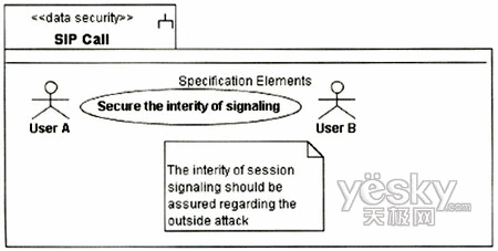圖3中的UA代表UserA或UserB的UA,因?yàn)閮蓚UA的信令交互需要通過Proxy,且其安全需求是一致的,故在圖中只表現(xiàn)出一方。UA和Proxy均是基于通用計算平臺的節(jié)點(diǎn),其訪問控制需要受到保護(hù),故對其標(biāo)記上定型《guardedaccess》。UA中除處理信令外,還需處理媒體流的編解碼與控制,這個用例中只涉及信令的安全性,故在UA中只關(guān)注進(jìn)行信令控制的組件。UA與Proxy之間的通信基于IP承載,根據(jù)表1定義的威脅函數(shù):ThreatA(IP