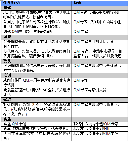 4. 開展項(xiàng)目交流。管理人員必須就新的或者修繕后的QM計(jì)劃與代理商進(jìn)行交流。QM的成功與否與代理商的合作密不可分,如果代理商受邀參與新QM計(jì)劃的開發(fā)并且所有改變都在雙方之間明確交流過,那么成功的機(jī)會(huì)也將大大提高。交流的內(nèi)容應(yīng)包括為什么要開發(fā)這樣一個(gè)計(jì)劃,它的作用和職責(zé)是什么,它對代理商會(huì)產(chǎn)生哪些影響(對于他們的評估和提升)以及它能帶來哪些好處。幫助代理商認(rèn)識(shí)到QM計(jì)劃積極的一面很重要,因?yàn)橹挥羞@樣才能讓他們看到QM不僅僅是管理人員用來告訴他們做錯(cuò)了事情的一種手段。讓聯(lián)絡(luò)中心全體員工參與QM計(jì)劃的開發(fā)能夠建立他們對該計(jì)劃的支持,提高接受度的同時(shí)避免不知所措。這對聯(lián)絡(luò)中心剛剛嶄露頭角,QM計(jì)劃還未全面鋪開的中國市場而言尤為重要。