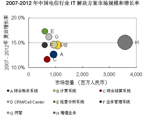 巨大的電信市場蛋糕給產業(yè)鏈的各級廠商都帶來良好的發(fā)展機遇,而其運營支撐系統(tǒng)市場無疑將是增長最快的一部分。據市場調查機構IDC預計,2007年-2012年電信行業(yè)將注重運營支撐系統(tǒng)的全業(yè)務運營整合和支持前端業(yè)務,因此3G增值業(yè)務、經營分析系統(tǒng)、客戶關系管理系統(tǒng)、IT服務管理系統(tǒng)等建設將實現快速增長。運營商的已有項目仍然會持續(xù)升級維護,以及配合全業(yè)務運營作出功能上的提升。IDC預計,2012年電信行業(yè)IT解決方案整體市場規(guī)模將達到193.5億元人民幣。