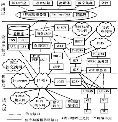 應(yīng)用層包括SIP應(yīng)用服務(wù)器、Parlay/OSA和智能網(wǎng)。Parlay/OSA提供的標準應(yīng)用編程接口(API),提供了一個開放的業(yè)務(wù)平臺,有利于第三方的業(yè)務(wù)提供。具體的業(yè)務(wù),如語音、視頻、即時消息、數(shù)字集群等都可以融合在統(tǒng)一的平臺上。
