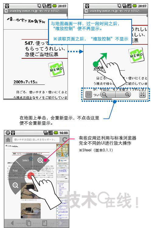 圖片說(shuō)明: 利用不同操作調(diào)出同一工具為在Android的標(biāo)準(zhǔn)瀏覽器(上面的兩個(gè)畫(huà)面)上調(diào)出縮放畫(huà)面顯示的工具(縮放控制),用手指拖拽畫(huà)面(向一個(gè)方面滑動(dòng))。為利用地圖應(yīng)用軟件調(diào)出同一工具,需要輕敲畫(huà)面(敲擊)能從在Android市場(chǎng)上下載的瀏覽器(下面的畫(huà)面)有能夠利用完全不同的UI縮放畫(huà)面的工具。