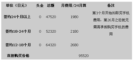 我們都知道日本的購(gòu)買手機(jī)最主要是和運(yùn)營(yíng)商簽約購(gòu)買,我們以夏普2009年夏季最新款手機(jī)Soft Bank 933SH為例,來(lái)說(shuō)明一下在日本購(gòu)買手機(jī)的成本?偟膩(lái)說(shuō),就是簽約時(shí)間越長(zhǎng),購(gòu)買手機(jī)價(jià)格越低,簽約時(shí)間越短,購(gòu)買價(jià)格越高。