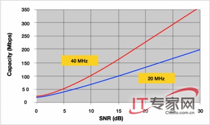 802.11n還增加了另一種新性能——更大的渠道。渠道帶寬從20MHz增加到了40MHz,等于讓可用帶寬翻了一番。下面圖表很好地展示了這一點(diǎn):