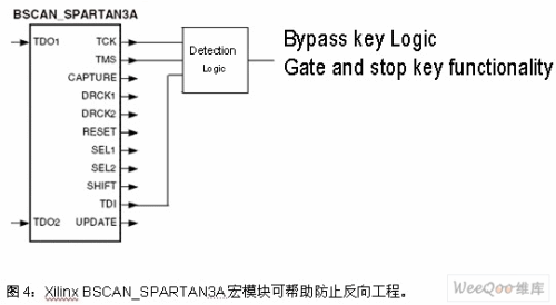 一些FPGA平臺可幫助防止發(fā)生這一過程,同時仍然允許生產(chǎn)商完成其管腳至管腳(pin-to-pin)功能。例如,在Xilinx? Spartan?-3A 平臺中, 可在設(shè)計中使用BSCAN_SPARTAN3A宏模塊,其檢測邏輯可監(jiān)控FPGA構(gòu)造中的JTAG控制信號,如圖4所示。如果檢測到JTAG控制信號的活動,用戶在設(shè)計可以立即繞過關(guān)鍵邏輯或關(guān)斷關(guān)鍵功能,不再執(zhí)行正確的功能。這樣反向工程人員讀到的將是不正確的功能模塊,在不能完成預期功能的解決方案上浪費時間和資源。