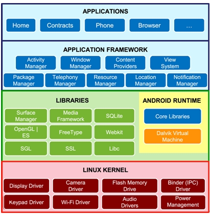 應(yīng)用程序(Application):所有Android應(yīng)用程序皆是以Java程序語(yǔ)言編寫,原始就會(huì)包含像是Email、簡(jiǎn)訊、日歷、地圖、瀏覽器、聯(lián)絡(luò)人等其它應(yīng)用程序,讓用戶一開始就擁有這些基本功能,開發(fā)者也可在此客制其使用接口。