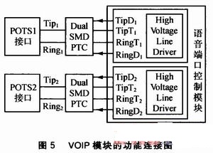 VOIP模塊的功能連接圖如圖5所示。Dual SMD PTC叫做雙重?zé)崦綦娮瑁蓪?duì)過(guò)熱和過(guò)流雙重作用導(dǎo)致的電路故障進(jìn)行保護(hù);Tip and Ring(正極線和負(fù)極線)表示組成電話配線電路的兩條電線,Tip是正極線的別稱,Ring是負(fù)極電線的別稱。