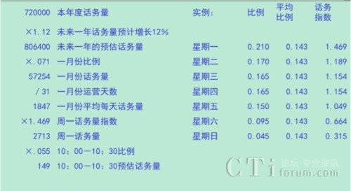 在上圖所示的比例分解過程中,我們假設(shè)去年的總來電量為720000個。在此基礎(chǔ)上,根據(jù)市場、銷售預(yù)測以及過去幾年歷史數(shù)據(jù)增長趨勢等數(shù)據(jù)測算出未來一年的話務(wù)量預(yù)計增長12%。這樣我們就得到了預(yù)計未來一年的總來電量為806400個。根據(jù)歷史數(shù)據(jù)的測算分析,一月份的來電量通常占全年總來電量的7.1%,因此明年一月份的來電量預(yù)計為57254個。由于呼叫中心是7X24小時運營的,所以一月份平均每天的來電量為57254/31=1847個。由于大多數(shù)呼叫中心的來電量規(guī)律是以一周為周期循環(huán)波動的,因此我們接下來要測算四個(或五個)周一的話務(wù)指數(shù),以覆蓋四個或五個周一的來電量情況。我們用周一來電量占全周來電量的相對比例除以其七分之一的絕對比例,得出周一的來電量指數(shù)為1.469,也就是說,周一的來電量是相對較多的,相當于一周日平均來電量的約147%。由此我們得出周一話務(wù)量為2713個。然后我們再根據(jù)由歷史數(shù)據(jù)測算出的周一一天中48個半小時時段占全天來電量的比例測算出周一上午10:00-10:30的來電量為149個。剩下的周二至周日都可以采用同樣的方法來推算預(yù)測。