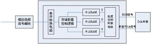 由于YUV信號(hào)在模擬信號(hào)中是交織著的,所以需要一個(gè)信號(hào)選擇電路。YUV一共是三路信號(hào),設(shè)計(jì)一個(gè)計(jì)數(shù)器進(jìn)行選擇,計(jì)數(shù)是O和2時(shí),是UV信號(hào),計(jì)數(shù)是1和3時(shí)是Y信號(hào),完成的實(shí)際上是串行信號(hào)轉(zhuǎn)并行信號(hào)的過(guò)程。以上過(guò)程可以用圖3的原理框圖來(lái)表示。