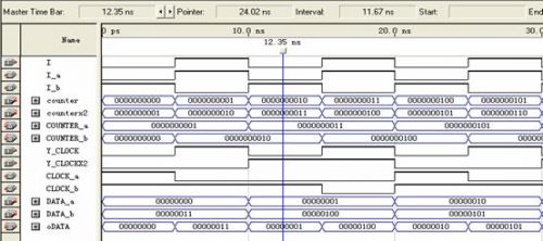 使用的信號(hào)包括:數(shù)據(jù)信號(hào)data_a,dat_b;讀寫(xiě)有效信號(hào)wren_a,wren_b;地址信號(hào)address_a,address_b;時(shí)鐘信號(hào)clock_a,clock_b;輸出數(shù)據(jù)信號(hào)q_a,q_b。可以看到所有的信號(hào)都是成對(duì)出現(xiàn)的,就是為了進(jìn)行乒乓方式的數(shù)據(jù)傳輸。分成了兩個(gè)RAM區(qū)域,A和B,相當(dāng)于前面講乒乓方式里的數(shù)據(jù)緩沖模塊1和2。兩個(gè)RAM塊是交替著讀寫(xiě)(由I_a和I_b決定),輸出數(shù)據(jù)流也是由I決定。剛說(shuō)到寫(xiě)時(shí)鐘是13.5M,讀時(shí)鐘是27M,所以clock_a和clock_b必須是讀寫(xiě)時(shí)鐘切換著輸入,而且地址的計(jì)數(shù)也不一樣,寫(xiě)周期時(shí)候地址增加的時(shí)鐘是13.5M,讀周期地址增加的時(shí)鐘是27M。所以每行的數(shù)據(jù)讀了兩遍,相當(dāng)于隔行變逐行。圖6在Qartus II下RAM的乒乓操作功能仿真圖: