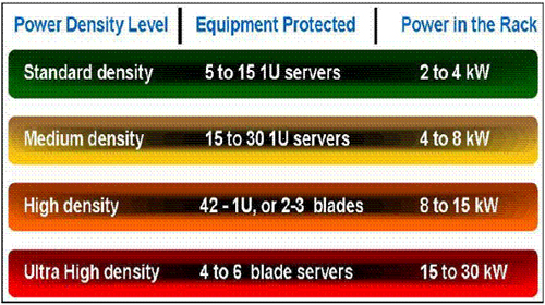當企業(yè)部署刀片式服務器來宿主其虛擬服務器時尤其如此。刀片式服務器采用多個即插即用型處理裝置,它們共享公共的電氣系統(tǒng)、電源、風扇、電纜和存儲器。這樣的安排節(jié)省了數(shù)據(jù)中心的占地面積,簡化了硬件管理,并提高了IT靈活性。然而,這同時也大大增加了運算密度。結果,刀片式服務器產生大量的熱,從根本提高了機柜級供電要求。確實,一個典型的傳統(tǒng)服務器機柜可能需要4至6 kW電力,而一個典型的布滿刀片式機架的機柜則可能需要高達30 kW的電力,遠遠超過許多電源和冷卻系統(tǒng)的處理能力。
