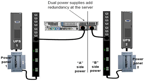 2(N)架構與含有雙電源的服務器配合使用。在這種排列中,每個電源一般都是利用一個獨立的供電路徑。那樣,即使整個動力總成都關機進行維修或維護,服務器仍然可用。