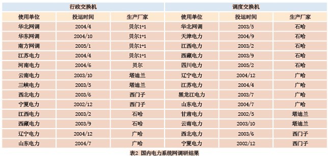 通過對目前國內(nèi)電力系統(tǒng)網(wǎng)省一級的用戶使用交換機(jī)設(shè)備品牌進(jìn)行電話調(diào)研統(tǒng)計,從整體上更能體現(xiàn)交換設(shè)備技術(shù)發(fā)展走向,為軟交換應(yīng)用的可行性評估提供可靠的數(shù)據(jù)。表2為重點調(diào)研的匯總結(jié)果。