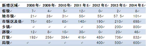 國家“十一五”規(guī)劃要求應(yīng)急建設(shè)覆蓋到省級,“十二五”要求覆蓋到村級。據(jù)調(diào)研,政府省級應(yīng)急平臺建設(shè)一般需2000萬元;地市級500~1000 萬元;市轄區(qū)及縣級在100萬;鄉(xiāng)鎮(zhèn)級50萬。而根據(jù)行政區(qū)域劃分,綜合指揮調(diào)度系統(tǒng)一般占應(yīng)急平臺投資的5%-20%。目前,我國政府應(yīng)急平臺建設(shè)覆蓋到省級、部分地市級及少量縣級,大量的縣級市及縣級、鄉(xiāng)鎮(zhèn)級并未覆蓋,而且之前的投入多以硬件系統(tǒng)集成為主,后續(xù)有很大的建設(shè)的空間。