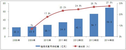 根據(jù)對下游行業(yè)的調(diào)研和關(guān)聯(lián)市場的分析,2010年,中國指揮調(diào)度市場規(guī)模已達(dá)到28.1億元。隨著下游行業(yè)投資規(guī)模的擴(kuò)大、產(chǎn)品的升級換代及技術(shù)的發(fā)展,行業(yè)市場規(guī)模將保持較快的增長速度,未來4年的復(fù)合增長率為26.31%,2014年,市場規(guī)模將達(dá)到69.8億元。