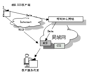 國際上一些先進的 呼叫中心產(chǎn)品供應(yīng)商現(xiàn)在已經(jīng)把 Web 技術(shù)引入到他們的產(chǎn)品中了。通過屏幕上的一個按鈕可以利用 Internet 電話把客戶和呼叫中心連接起來?蛻羰褂靡粋很普通的帶有麥克風(fēng)﹑聲卡以及傳輸速率不小于 28.8 kbps 的Modem 的多媒體 PC 機,并配有 Web 瀏覽器以及與 H.323兼容的應(yīng)用軟件就可以利用把他們連接到 Web 站點的那條電話線與呼叫中心的座席員交談。其簡單示意圖如下: