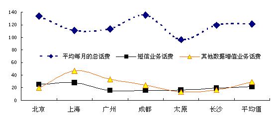 調(diào)查數(shù)據(jù)顯示,在所訪6個城市的手機用戶中,過去三個月平均每個月的話費總額平均為121.3元(以北京和成都的用戶平均總話費較高),其中短信話費平均每月為14.0元,而其它數(shù)據(jù)增值業(yè)務話費平均話費為4.8元。