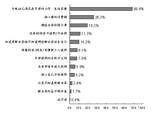 調(diào)查發(fā)現(xiàn),目前制約手機用戶使用更多數(shù)據(jù)增值業(yè)務的原因主要是:“打電話已經(jīng)滿足目前的工作/生活需要”(占68.6%)、“擔心增加消費額”(占26.2%)、“增值業(yè)務價格太貴” (占19.2%)、“沒有時間學習使用/不會用”(占11.3%)、“知道有新業(yè)務但不知道哪些新業(yè)務適合自己”(占10.2%)等。