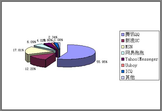 根據(jù)本次報告的“即時通信軟件使用情況分析”,新浪UC僅比排名第二的MSN相差5個百分點,并以超過一倍的相當(dāng)優(yōu)勢超越排名第四、第五的其他IM軟件。至此,國內(nèi)IM領(lǐng)域已經(jīng)形成了以騰訊QQ、微軟MSN、新浪UC三大巨頭“瓜分天下”的格局,三者之和牢牢掌控了國內(nèi)IM領(lǐng)域?qū)⒔?6%以上的市場份額(圖二)。
