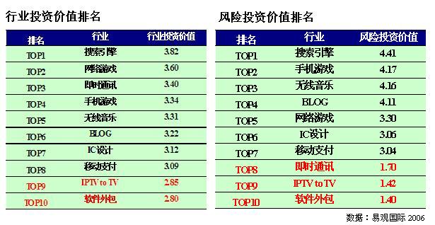 3G 牌照的發(fā)放,手機(jī)游戲、無(wú)線音樂(lè)、移動(dòng)支付、博客等行業(yè)投資潛力都將有所提高,其中手機(jī)游戲、無(wú)線音樂(lè)和博客分別列居第二、第三、第四,成為未來(lái)三年中高增長(zhǎng)行業(yè)。即時(shí)通訊行業(yè)投資價(jià)值排名第三,由于其商業(yè)模式的低創(chuàng)新,致使其風(fēng)險(xiǎn)投資價(jià)值僅為倒數(shù)第三,不具備風(fēng)險(xiǎn)投資價(jià)值。隨著汽車行業(yè)、消費(fèi)電子行業(yè)逐步向智能化、數(shù)字化發(fā)展,IC
