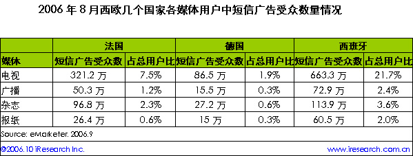 iResearch艾瑞市場咨詢根據(jù)eMarketer資料整理顯示,短信廣告在西歐國家大行其道,成百上千萬的移動用戶訂閱了廣告短信。西歐各國不同媒體訂閱廣告短信的用戶數(shù)不盡相同?傮w上來看,西班牙的短信廣告受眾最多,電視用戶中有21.7%人訂閱了短信廣告,數(shù)量達663.3萬。相比之下,法國電視用戶中的短信廣告受眾只有西班牙的1/2,德國則更少。
