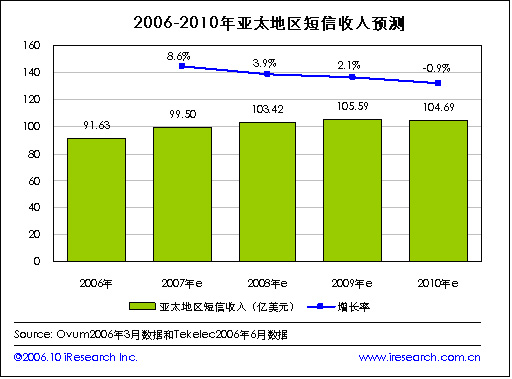 iResearch艾瑞市場咨詢根據(jù)咨詢公司Ovum和網(wǎng)絡(luò)應(yīng)用公司Tekelec在2006年的數(shù)據(jù)整理發(fā)現(xiàn),到2010年亞太地區(qū)的短信收入有望達到104.69億美元,2006年亞太地區(qū)的短信收入在91.63億美元。