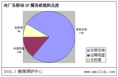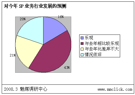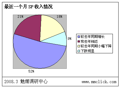 最近公布的空中網(wǎng)財(cái)務(wù)報(bào)表的數(shù)據(jù)顯示空中網(wǎng)總收入環(huán)比增長,結(jié)合之前廣東移動推出:廣東移動向重服務(wù)轉(zhuǎn)變 首推“6+1”服務(wù),SP行業(yè)可以說是暖風(fēng)頻吹。魅媒無線行業(yè)調(diào)研中心隨機(jī)從3月3日到3月5日隨記電話采訪50多家全網(wǎng)以及廣東省網(wǎng)SP公司相關(guān)負(fù)責(zé)人,對最近的SP行業(yè)的政策調(diào)整進(jìn)行調(diào)查,有以下的數(shù)據(jù):