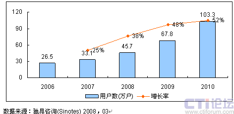 圖1 2008-2010年中國無線電郵業(yè)務(wù)用戶規(guī)模預(yù)測