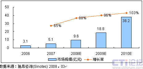 毫無疑問,3G將成為無線電郵市場最有利的推動因素,3G的先進技術(shù)和網(wǎng)絡(luò)將賦予無線電郵比普通單一短信更加豐富的應(yīng)用空間,它有望成為繼短信之后的又一個“殺手級”業(yè)務(wù)。預(yù)計未來三年,無線電郵市場將呈現(xiàn)爆發(fā)式的增長,市場規(guī)模將從2007年5.1億元上升到2010年的38.2億元。