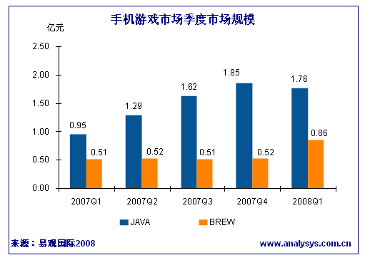 2008年第1季度中國JAVA/BREW手機游戲市場規(guī)模達2.61億人民幣