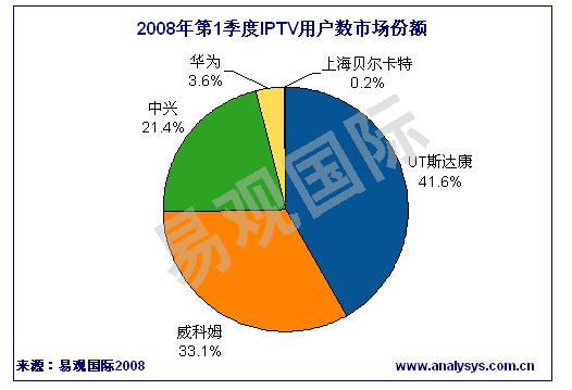 《2008年第1季度中國IPTV市場(chǎng)季度監(jiān)測(cè)》數(shù)據(jù)顯示,2008年第1季度中國IPTV累計(jì)用戶數(shù)達(dá)131萬人。根據(jù)各廠商中標(biāo)業(yè)務(wù)區(qū)實(shí)際發(fā)展的用戶數(shù)排名,UT斯達(dá)康、威科姆、中興通訊位居前三。2008年第1季度IPTV廠商的競(jìng)爭(zhēng)格局沒有顯著變化。