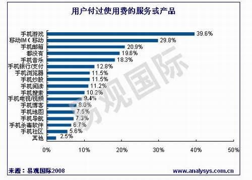 據(jù)易觀國際《中國手機(jī)應(yīng)用市場用戶調(diào)研報告2008》研究發(fā)現(xiàn),用戶付過使用費(fèi)的手機(jī)應(yīng)用服務(wù)及產(chǎn)品中,手機(jī)游戲、移動IM和手機(jī)郵箱的比例較高。其中39.6%的手機(jī)應(yīng)用用戶付費(fèi)玩過手機(jī)游戲,29.8%的用戶曾經(jīng)為移動IM付費(fèi),而手機(jī)郵箱的付費(fèi)用戶將達(dá)20%。其他手機(jī)應(yīng)用產(chǎn)品或服務(wù)中,付費(fèi)用戶的比例相當(dāng),均在10%左右,但是有近20%的用戶沒有用過任何的付費(fèi)服務(wù)或產(chǎn)品。