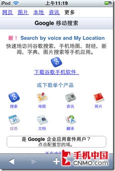 Google for iPhone的界面針對(duì)iPhone/ipod touch下的safari做了優(yōu)化,富客戶端在手持設(shè)備上,無論界面還是速度都達(dá)到近乎完美的地步。