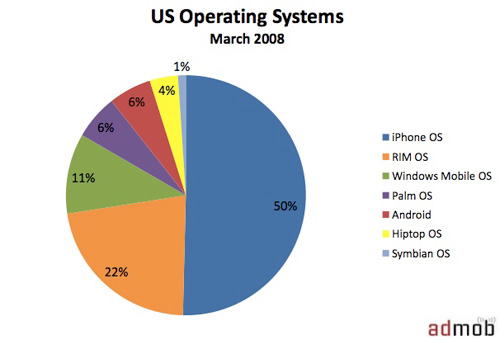 報告顯示,WindowsMobileDevices的份額從13%下滑至11%;黑莓的RIMOS上升1%,至22%;iPhone則維持50%不變。