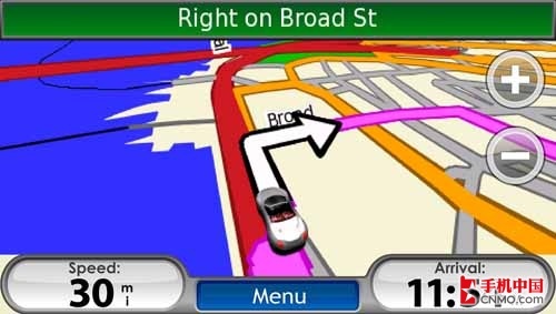 色彩豐富的界面、臨場(chǎng)感十足的導(dǎo)航界面,是Garmin Nuvifon帶給用戶的全新導(dǎo)航體驗(yàn)。用超酷的跑車(chē)來(lái)表現(xiàn)目前用戶所處的方位,極具創(chuàng)意之余也更加直觀;用戶也可通過(guò)觸摸虛擬按鍵來(lái)實(shí)現(xiàn)地圖的放大縮小。