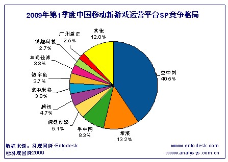 目前與新游戲平臺合作的SP包括空中網(wǎng)、騰訊、掌上明珠、TOM等在內(nèi)的共30家左右,在線游戲數(shù)量達(dá)80多款,從SP在新平臺的市場表現(xiàn)來看(具體見下圖):空中網(wǎng)占據(jù)中國移動新平臺信息費(fèi)收入40.5%的份額,這促使空中網(wǎng)在手機(jī)游戲市場占據(jù)第一名的位置,目前空中網(wǎng)在新游戲平臺投放的手機(jī)游戲主要有周星星功夫臺球、異三國Online、天劫Online、功夫(周星馳大片)等,其中手機(jī)網(wǎng)游“天劫Online”的用戶歡迎度尤其突出。手機(jī)網(wǎng)游產(chǎn)品中深藍(lán)創(chuàng)娛的“深藍(lán)棋牌樂園之斗地主”、掌上明珠的“幻想i時(shí)代”、廣州盈正的“文明OL”等均有不錯表現(xiàn)。因此用戶對手機(jī)網(wǎng)游產(chǎn)品的高關(guān)注度也肯定了了新游戲平臺推出的必要性。