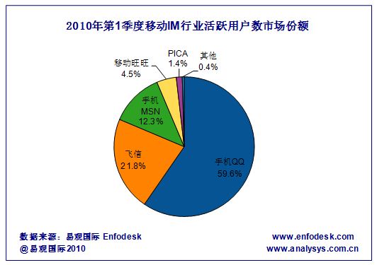 據(jù)易觀國際Enfodesk產(chǎn)業(yè)數(shù)據(jù)庫近期發(fā)布的《2010年第1季度中國市場移動IM數(shù)據(jù)監(jiān)測報告》研究顯示:2010年第1季度中國市場移動IM活躍用戶數(shù)環(huán)比增長超過18%,總數(shù)突破1.6億,累計(jì)賬戶數(shù)環(huán)比增長10.97%,總數(shù)超過3.8億,相比09年第4季度依然取得了較快的增長。但是基于整體市場來看,移動IM活躍用戶數(shù)市場格局并沒有發(fā)生太大變化,手機(jī)QQ仍然以59.6%的市占率名列市場第一,飛信、手機(jī)MSN位列二三名,具體市場占比及排名如下圖所示:
