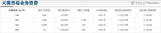 目前電信推出的黑莓手機套餐分為四類,一類為天翼黑莓簡裝版,價格為每月189元,包括60MB國內上網(wǎng)流量,100分鐘國內語音通話時長;第二類是天翼黑莓標準版套餐,價格為289元,包括100MB國內上網(wǎng)流量,0.5MB國際上網(wǎng)流量,400分鐘國內語音通話時長;第三類和第四類為天翼尊享版套餐包括389元和589元兩種資費,前者包括500MB國內上網(wǎng)流量,1MB國際上網(wǎng)流量,600分鐘國內語音通話時長;后者包括1GB國內上網(wǎng)流量,2MB國際上網(wǎng)流量,1000分鐘國內語音通話時長。