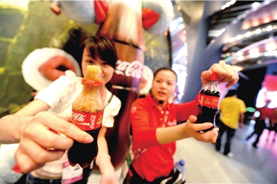 昨天世博園里溫度很高,記者逛得口干舌燥,抬頭看到一個(gè)高達(dá)15米的巨型LED可口可樂(lè)瓶,這是“快樂(lè)工坊”的招牌。
