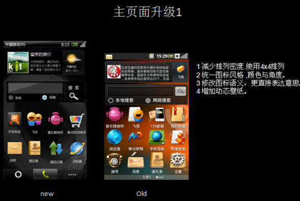 第二,主頁(yè)面全面升級(jí)。對(duì)操作系統(tǒng)而言,主頁(yè)面就是“臉面”。OPhone2.0在保持清爽風(fēng)格的基礎(chǔ)上,對(duì)眾多細(xì)節(jié)進(jìn)行了改進(jìn)升級(jí),使主頁(yè)面在美觀的同時(shí)更加人性化。具體包括:1.減少排列密度,使用4x4排列;2.統(tǒng)一圖標(biāo)風(fēng)格、顏色與角度;3修改圖標(biāo)語(yǔ)義,更直接表達(dá)意思;4.增加動(dòng)態(tài)壁紙。