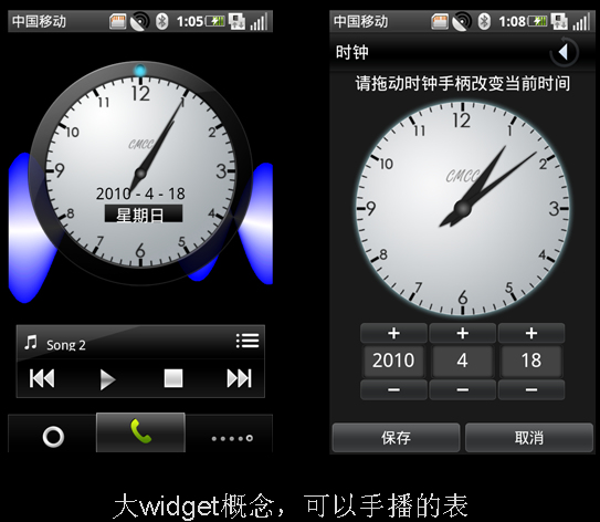 第三,引入大widget概念。Widget給用戶提供了簡(jiǎn)易接口來(lái)執(zhí)行一些常用功能。OPhone2.0版本首次引入了大widget概念,將手機(jī)人性化操作提升到了新的高度。譬如,手機(jī)最簡(jiǎn)單也是最常用的顯示時(shí)間功能,就在OPhone2.0中被設(shè)計(jì)成了一個(gè)“可以用手播動(dòng)的表”,用戶不必再繁瑣地輸入數(shù)字來(lái)修改時(shí)間。