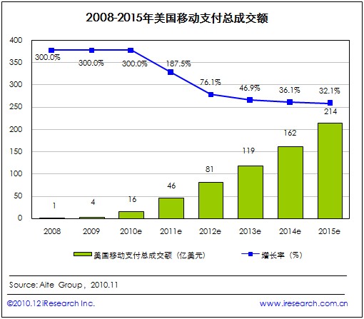 艾瑞咨詢根據(jù)Aite Group發(fā)布的數(shù)據(jù)發(fā)現(xiàn),2010年美國移動支付總成交金額預(yù)估值為16億美元,預(yù)計2015年這一數(shù)字將攀升至214億美元,將是2010年的13.4倍,復(fù)合年增長率為68%。長期以來,美國移動支付總成交額一直處于被低估的狀態(tài),但它的實際表現(xiàn)遠(yuǎn)比預(yù)想要好很多。其中,2010年到2011年增長率將高達(dá)187%。