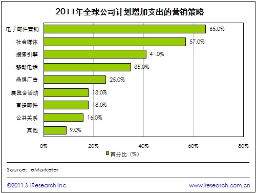 iResearch艾瑞咨詢根據(jù)eMarketer發(fā)布的調(diào)查研究報(bào)告發(fā)現(xiàn),2011年,全球65%的公司將在電子郵件營銷中增加支出,57%的公司愿意在社會(huì)媒體營銷中增加開支;而愿意在其他營銷策略增加支出的公司均未超過五成。
